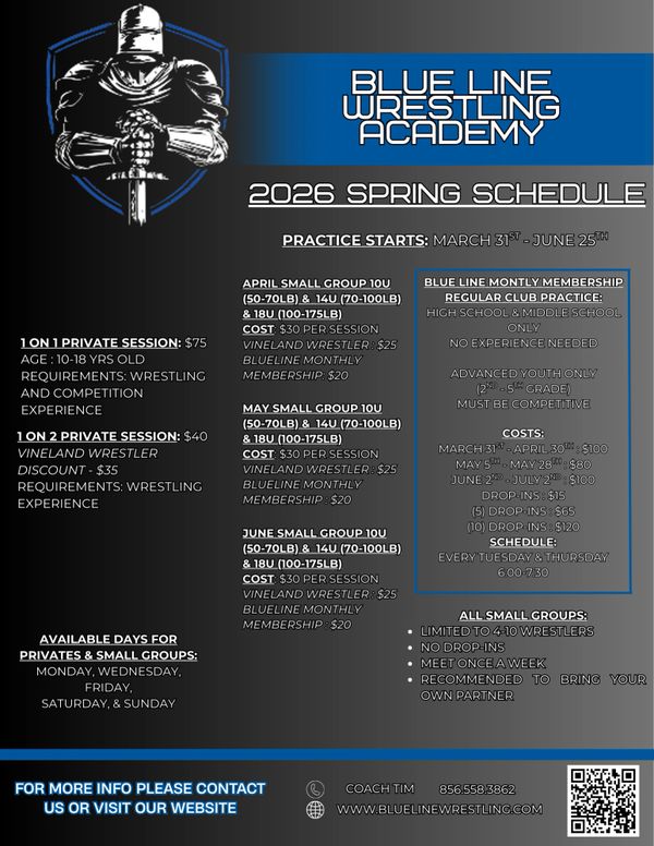 Off-Season training with Blue Line Wrestling Academy. Book your private wrestling practices or small practice groups and enhance your wrestlers fundamental and advance training! Located in Vineland NJ.